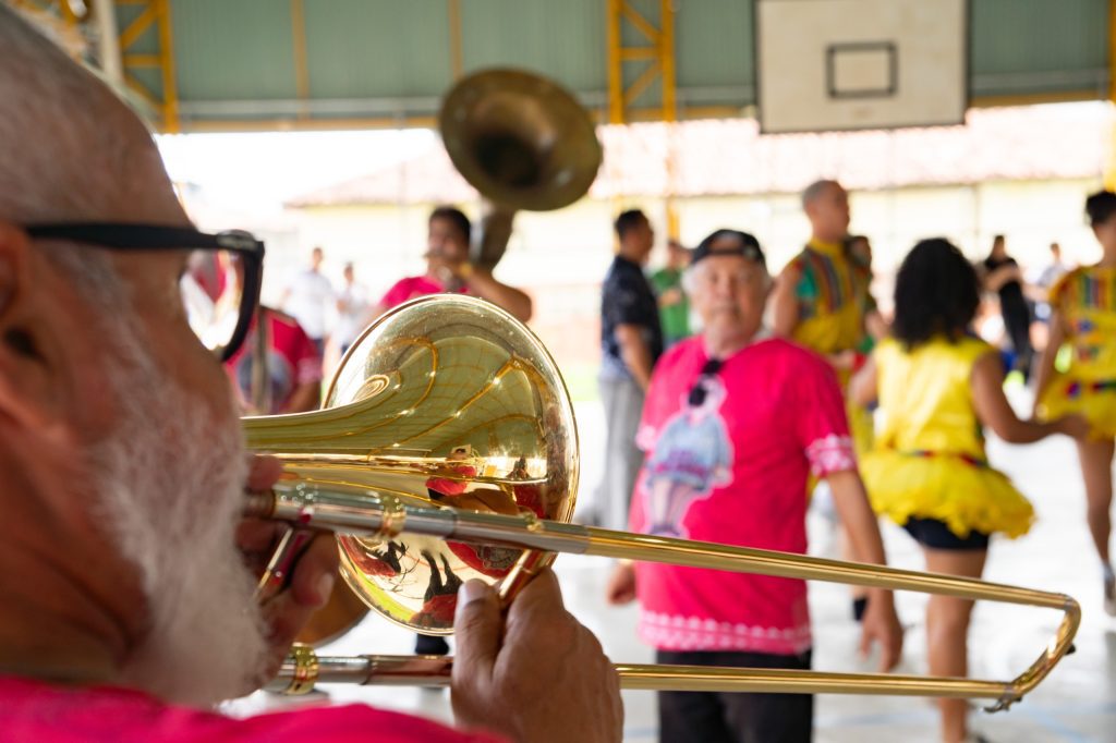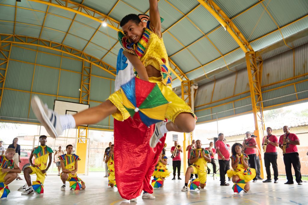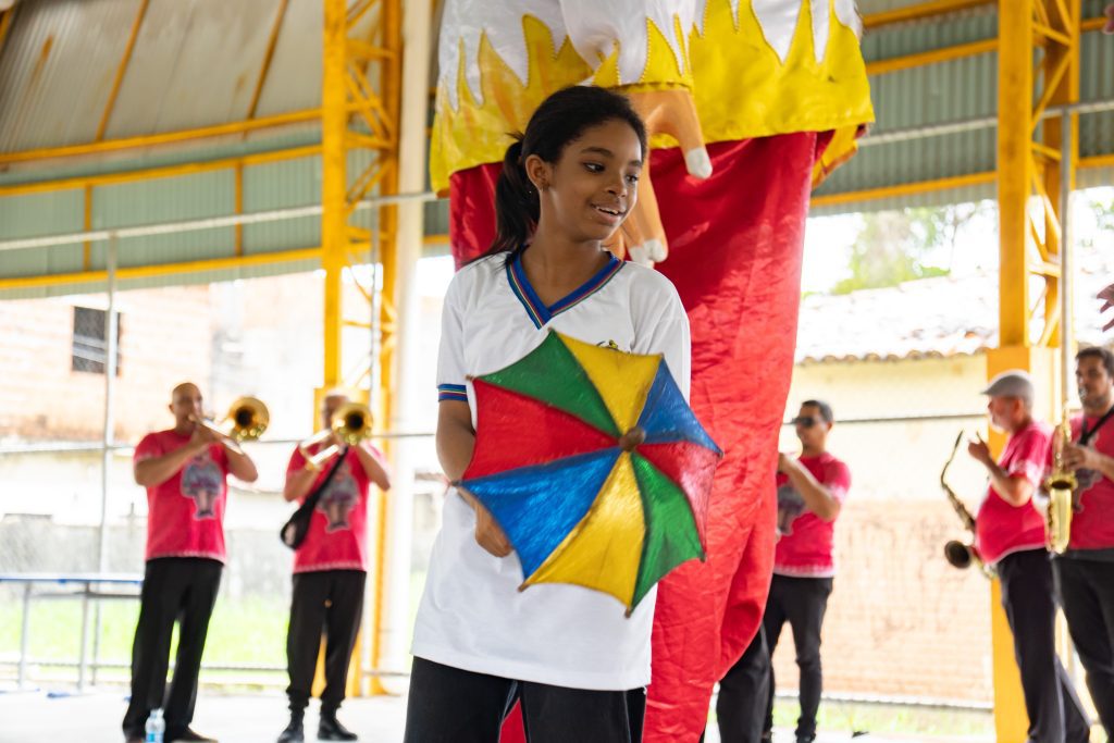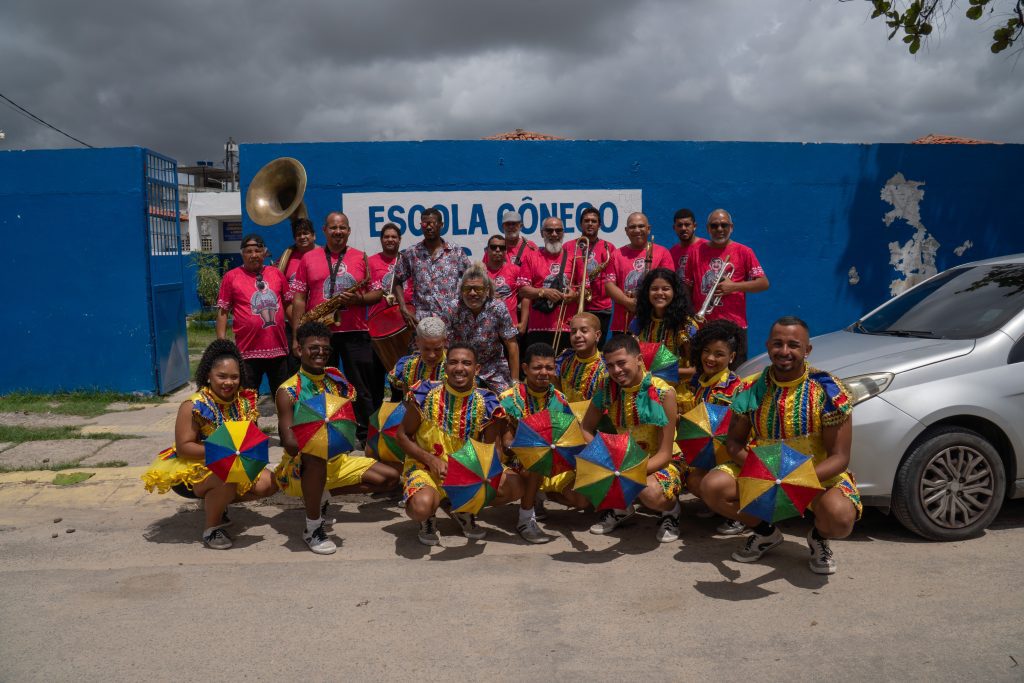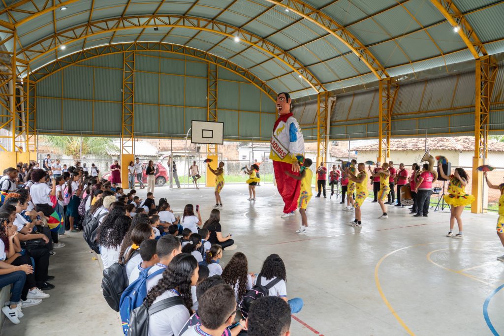 Uma das unidades contempladas esta semana foi a Escola Cônego Jonas Taurino, localizada no bairro de Peixinhos, em Olinda, que recebeu a apresentação do Clube de Boneco Seu Malaquias, Patrimônio Vivo de Pernambuco. A atividade reuniu bonecos gigantes, passistas e orquestra de frevo, proporcionando aos estudantes uma imersão nas manifestações que marcam a identidade cultural pernambucana, especialmente durante o período carnavalesco.