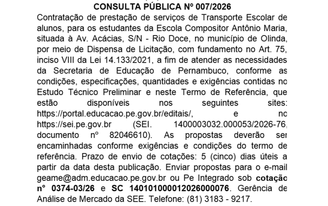 CONSULTA PÚBLICA COM O TEOR DE OBTER PREÇOS REFERENCIAIS – Nº 07/2026 13/03/202613/03/2026 Joas SouzaCONSULTA