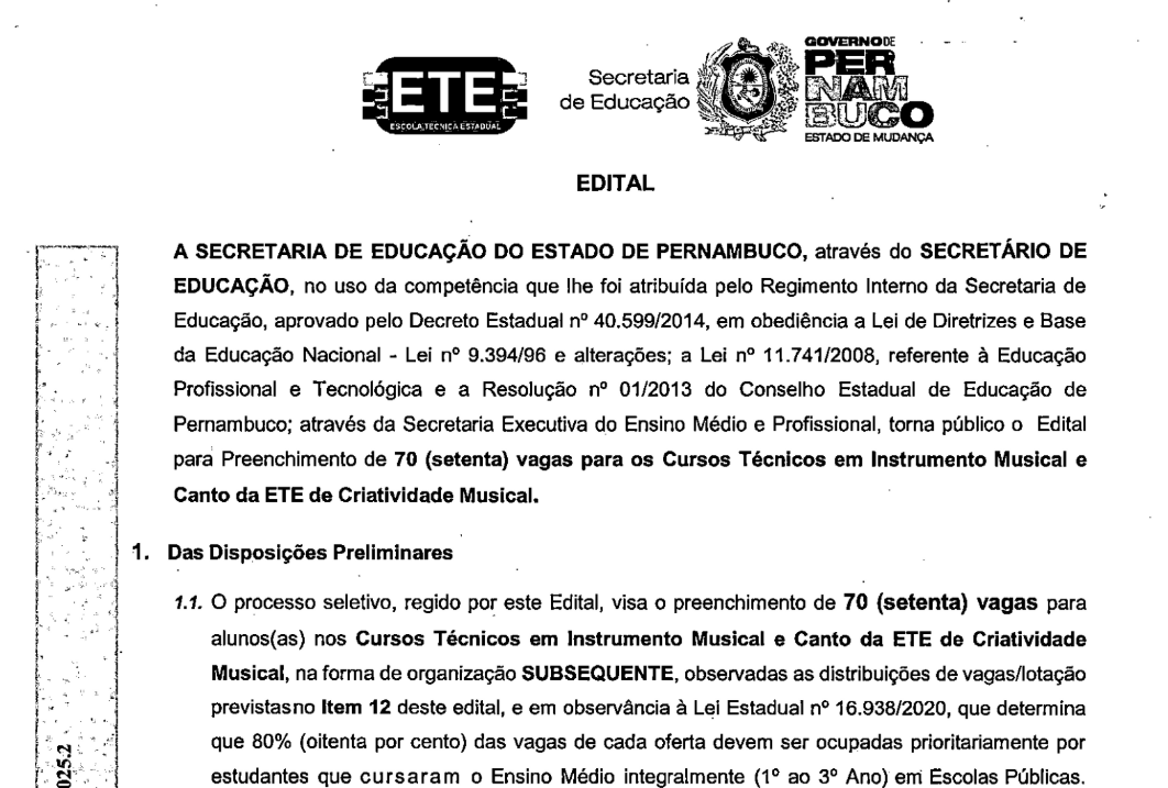 Edital do Certame 2025.2 da ETE Criatividade Musical – Preenchimento de 70 (setenta) vagas para alunos(as) nos Cursos Técnicos em Instrumento Musical e Canto