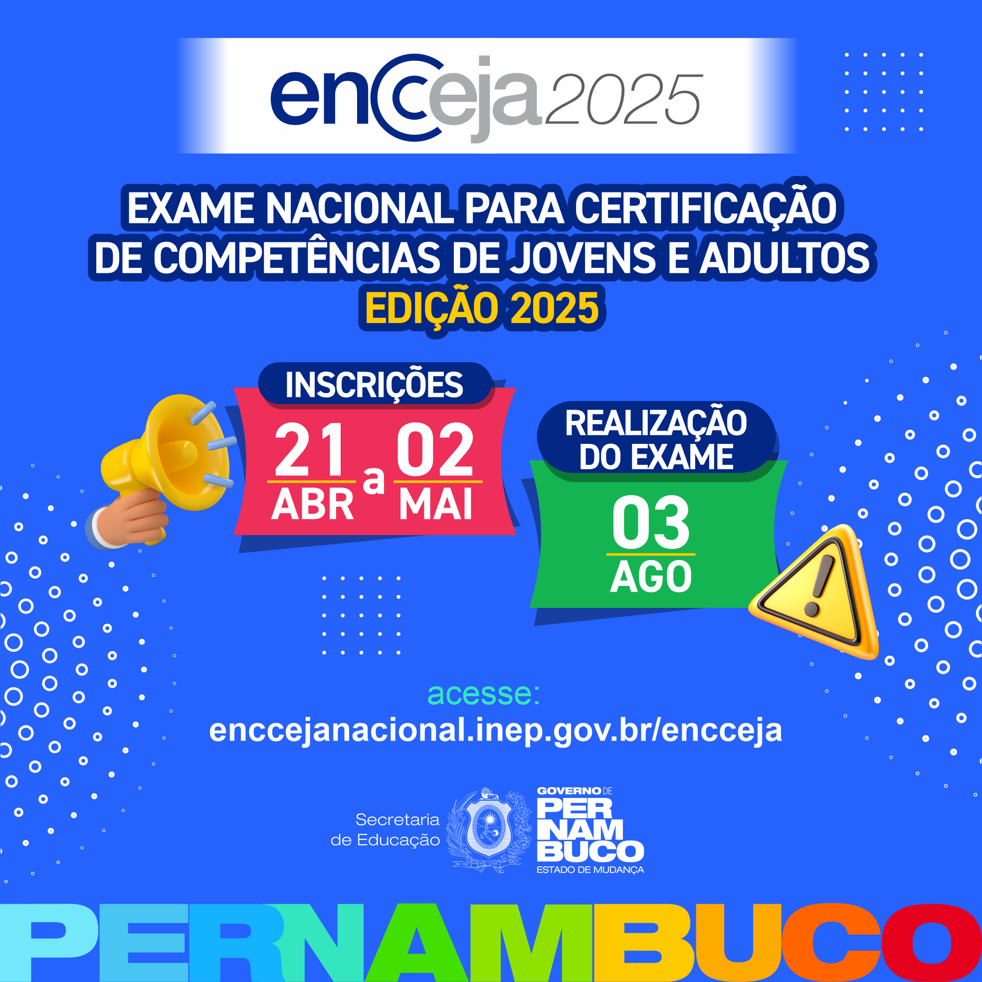 O Encceja Nacional 2025 será aplicado em todos os estados e no Distrito Federal, nos municípios indicados no sistema de inscrição, disponível em enccejanacional.inep.gov.br/encceja, e no Portal do Inep, no endereço https://www.gov.br/inep/pt-br/areas-de-atuacao/avaliacao-e-exames-educacionais/encceja