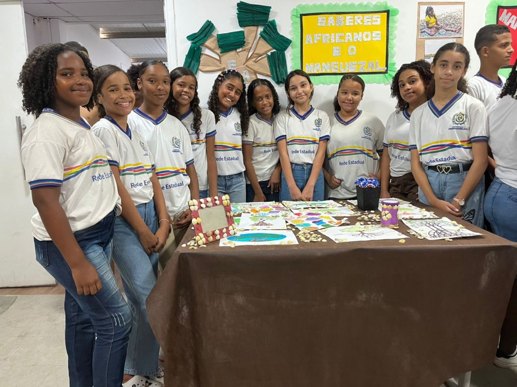 A equipe do 6º ano do ensino fundamental anos finais composta pelas estudantes Fernanda Sophia, Ana Beatriz, Daphyne Vitória, Rayane Letícia, Yasmin Luiza, Laila Yasmin, Maria Sophia, Rosália Graziely, Lara Letícia e Anali Vitória, apresentou um trabalho sobre a preservação dos manguezais. Com o tema “Saberes africanos e o manguezal”, as alunas compartilharam aprendizados construídos ao longo da pesquisa. “Nas pesquisas feitas em sala de aula e em casa, aprendi que não devemos poluir o mangue, ou a maré, como muitos falam. Não podemos poluir porque dali nascem muitas espécies e é o berço de vida de animais, como o tubarão. Aprendi isso pintando em sala, de uma forma mais didática e lúdica, além dos filmes que o professor indicou para assistirmos”, ressaltou Daphyne Vitória.