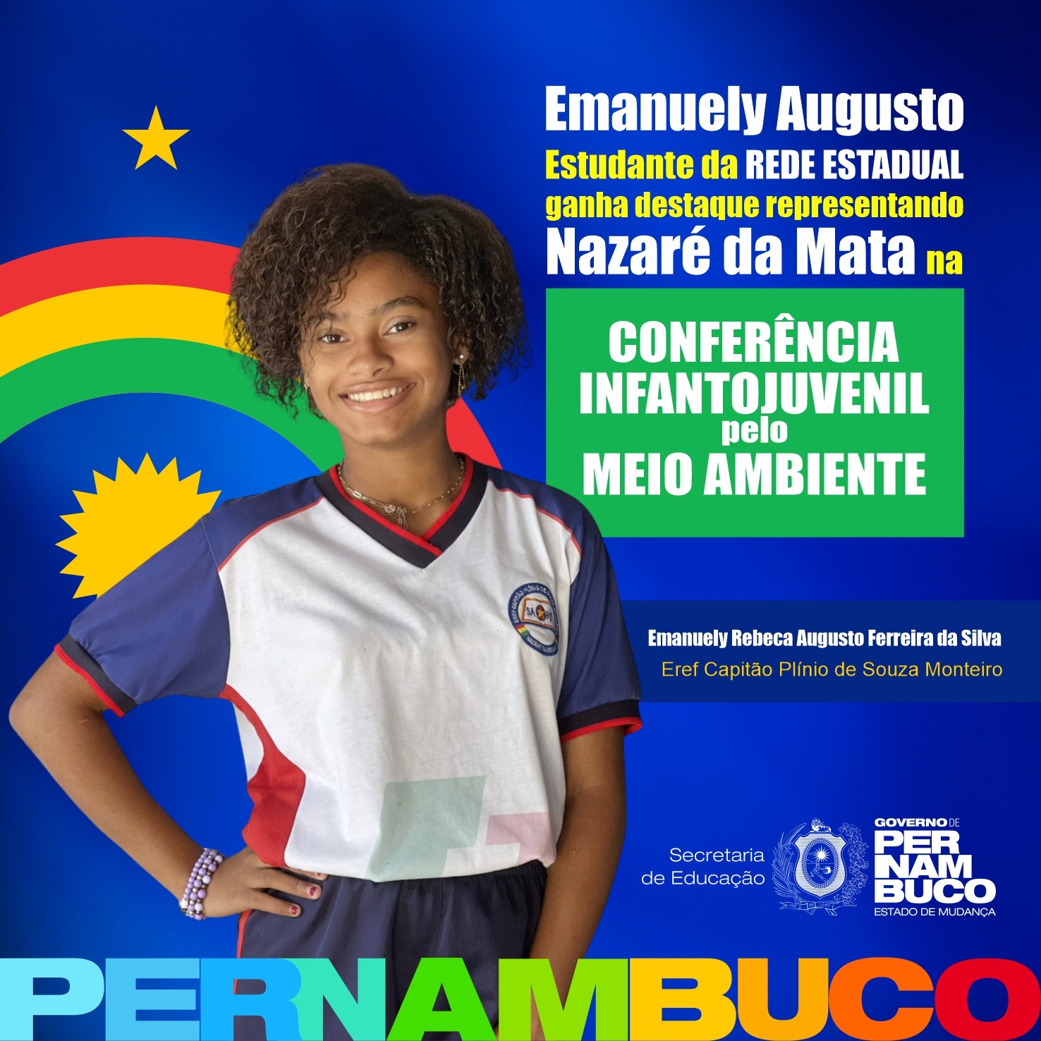 A estudante Emanuely Rebeca Augusto Ferreira da Silva, aluna do 6º ano da Escola de Referência em Ensino Fundamental (Eref) Capitão Plínio de Souza Monteiro, localizada no município de Nazaré da Mata, Zona da Mata, foi selecionada para representar Pernambuco na Conferência Nacional Infantojuvenil de Meio Ambiente, que será realizada em outubro, em Brasília, no Distrito Federal.