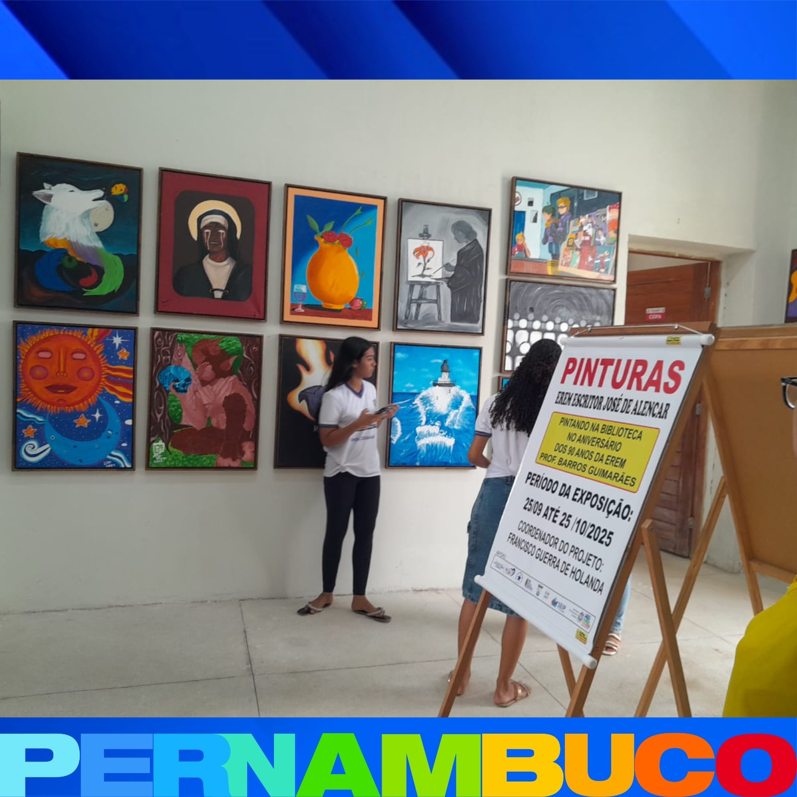 Estudantes da Escola de Referência em Ensino Médio (Erem) Escritor José de Alencar, localizada no município de Paulista, na Região Metropolitana do Recife, promovem uma exposição de artes até o dia 25 de outubro na cidade de Glória de Goitá, na Zona da Mata de Pernambuco. A mostra faz parte da 9ª edição do projeto “Pintando na Biblioteca”, que é desenvolvido na unidade de ensino e busca estimular os alunos a explorarem talentos nas artes plásticas. Ao todo, estão expostos 34 quadros. A visitação é aberta ao público na Erem Professor Barros Guimarães.