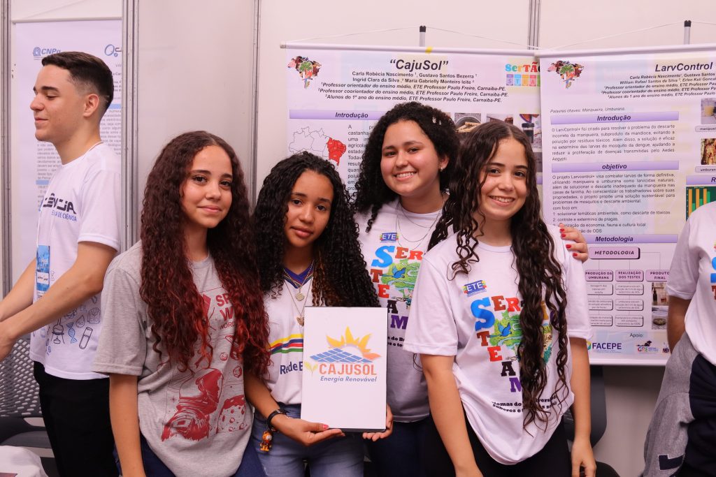Um dos grupos presentes foi composto por estudantes da Escola Técnica Estadual (ETE) Professor Paulo Freire, em Carnaíba, no Sertão, que uniram sustentabilidade e inovação para criar o projeto Cajusol, placas solares que utilizam o líquido da casca da castanha de caju (LCC) para produzir energia renovável. “O objetivo do nosso projeto é utilizar as cascas de caju para criar uma superfície seletiva para placas solares, utilizando o LCC, um líquido negro, viscoso e tóxico que é derivado da queima dessas cascas. O CajuSol não só barateia o alto custo das placas convencionais, como também contorna os impactos ambientais causados pelo descarte inadequado do LCC”, explica Ingrid Clara, uma das quatro alunas que compõem o projeto.