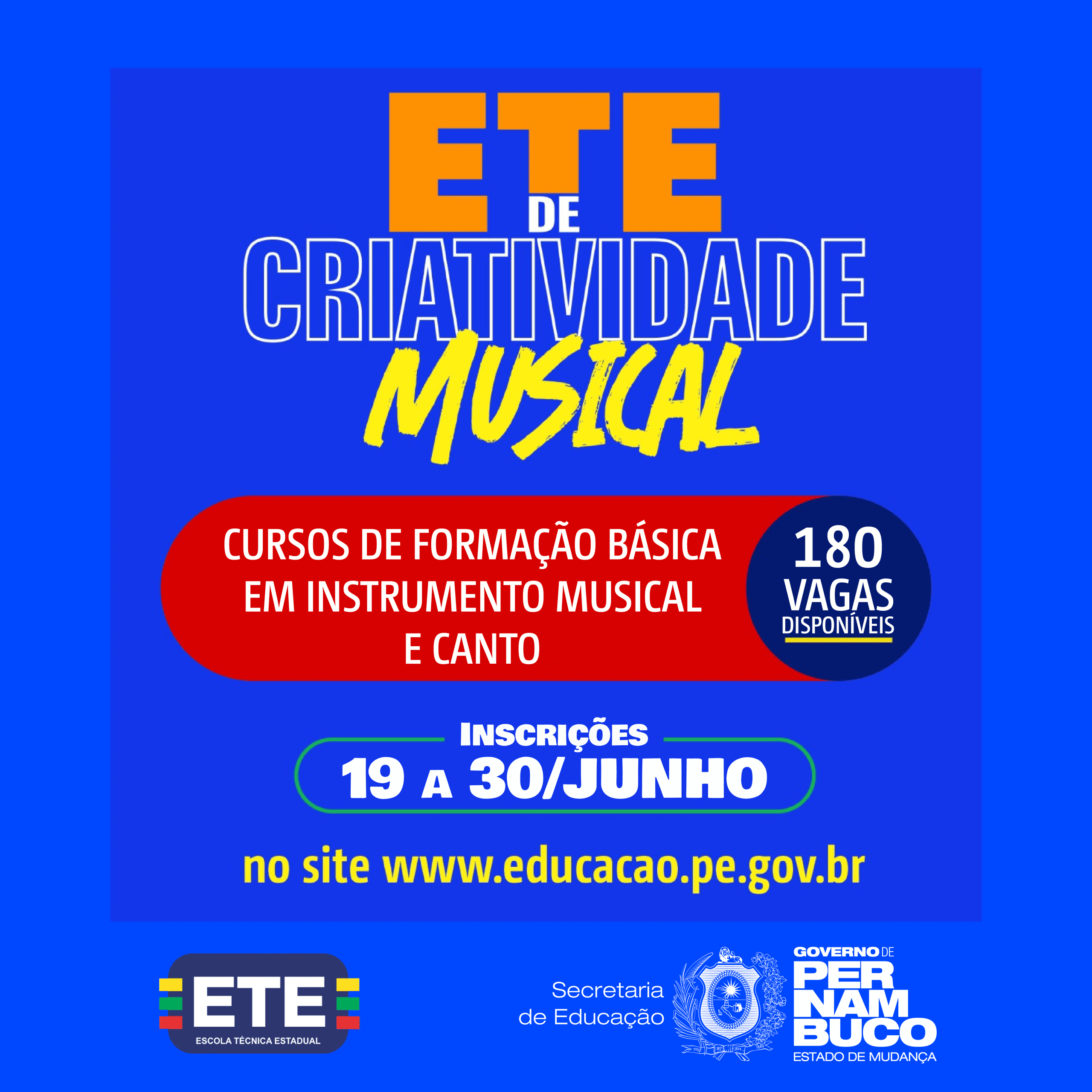 Estão abertas as inscrições para os cursos de Formação Básica em Instrumento Musical e Canto ofertados pela Escola Técnica Estadual (ETE) de Criatividade Musical. Ao todo, serão disponibilizadas 180 vagas. Os interessados devem se inscrever, gratuitamente, até o dia 30 de junho, pelo formulário eletrônico.