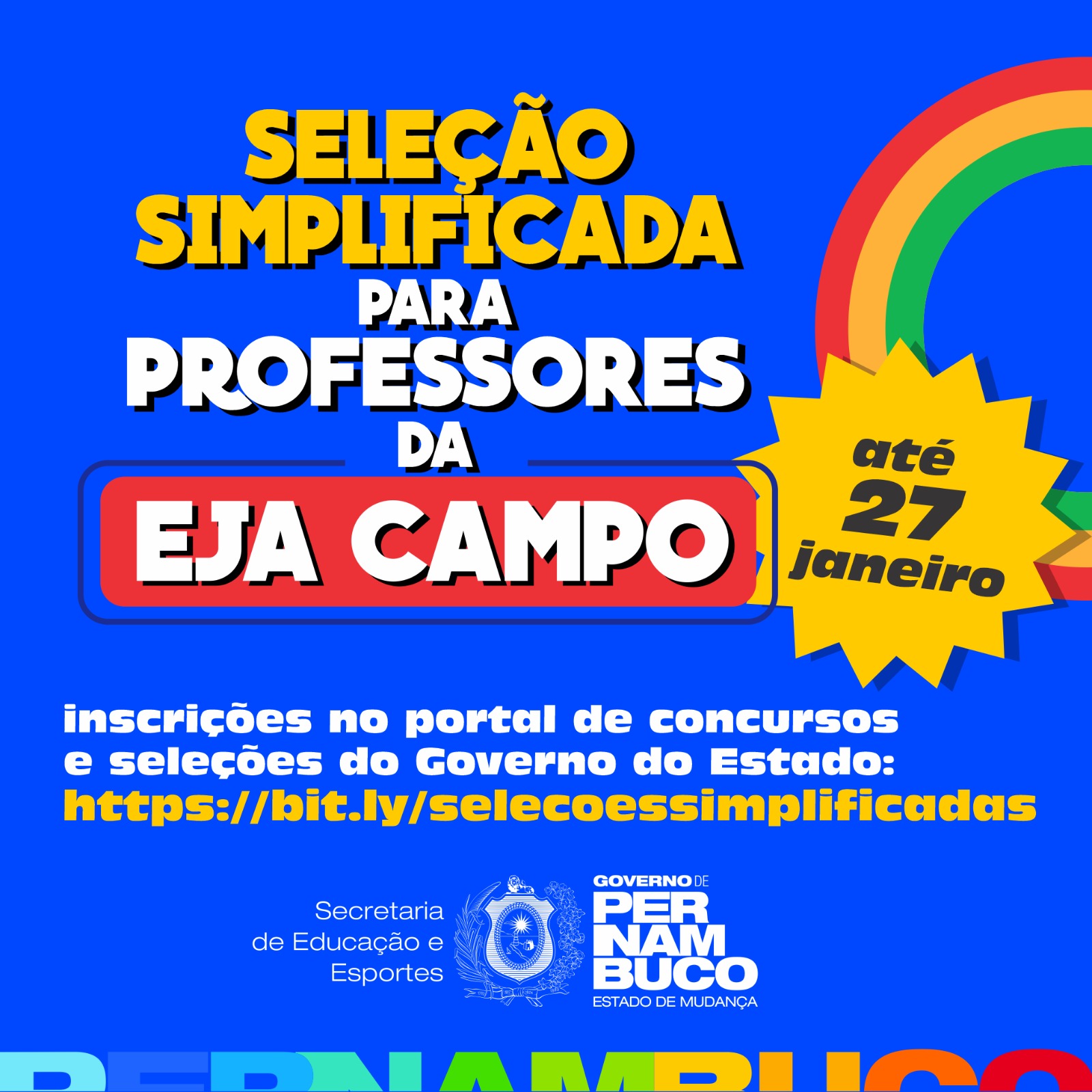 Estão abertas as inscrições para a seleção simplificada que visa preencher 271 vagas para professores de Educação de Jovens e Adultos (EJA) na Rede Estadual de Pernambuco. As inscrições são gratuitas e podem ser realizadas até o dia 27 de janeiro, através de formulário (CLIQUE AQUI para ter acesso) localizado no portal de concursos e seleções do Governo do Estado.