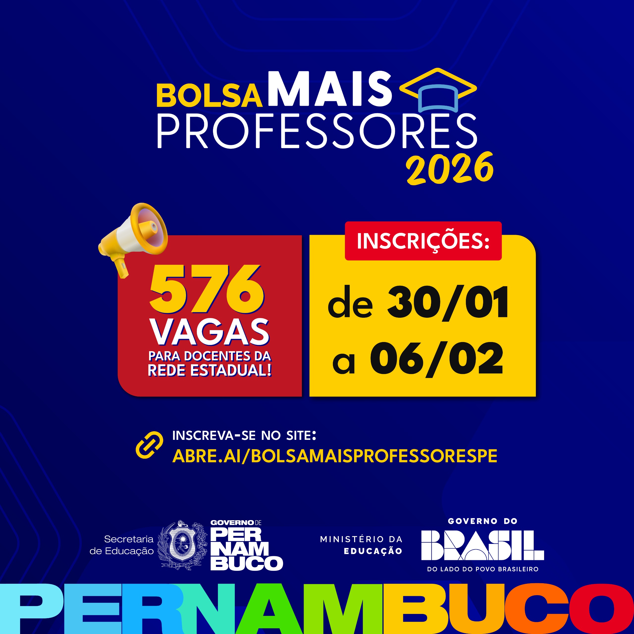 O Governo de Pernambuco, por meio da Secretaria de Educação do Estado (SEE), abriu as inscrições para o processo seletivo da Bolsa Mais Professores, que vai oferecer 576 bolsas a professores da rede estadual  em parceria com o Ministério da Educação (MEC). A iniciativa prevê a realização de um curso gratuito de especialização em docência para a educação básica, com bolsa de R$ 2.100 durante o período da formação. As inscrições podem ser realizadas até o dia 6 de fevereiro, pelo link abre.ai/bolsamaisprofessorespe.