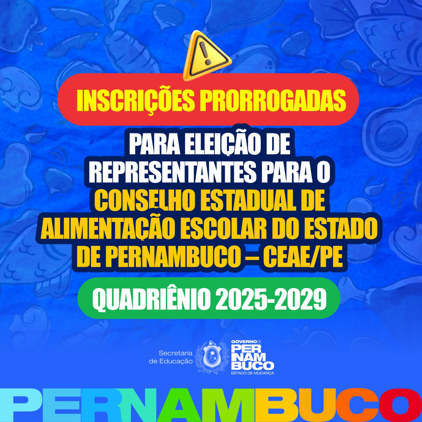 As inscrições para a eleição dos representantes do Conselho Estadual de Alimentação Escolar do Estado de Pernambuco (CEAE/PE) foram prorrogadas até o dia 05 de maio. Deverão ser eleitos membros titulares, acompanhados de seus respectivos suplentes para o quadriênio 2025-2029. Os interessados devem preencher o formulário de inscrição, disponível no edital, e enviá-lo para o e-mail eleicao.caepe@educacao.pe.gov.br.