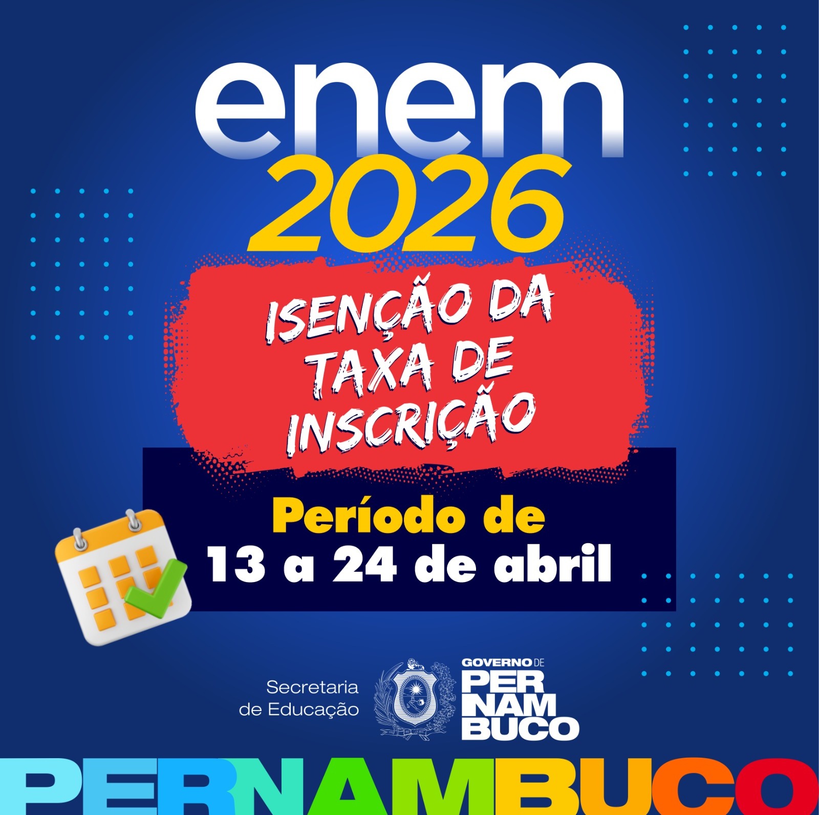 Começou nesta segunda-feira (13) o período para solicitar a isenção da taxa de inscrição no Exame Nacional do Ensino Médio (Enem) 2026, além da justificativa de ausência para quem faltou à edição de 2025. Os procedimentos podem ser realizados de 13 a 24 de abril, por meio da Página do Participante com login único do gov.br, no site do Instituto Nacional de Estudos e Pesquisas Educacionais Anísio Teixeira (Inep). Todos os estudantes concluintes do ensino médio em escola pública e da Educação de Jovens e Adultos (EJA) módulos II e III, devem solicitar a isenção. Confira aqui o edital.