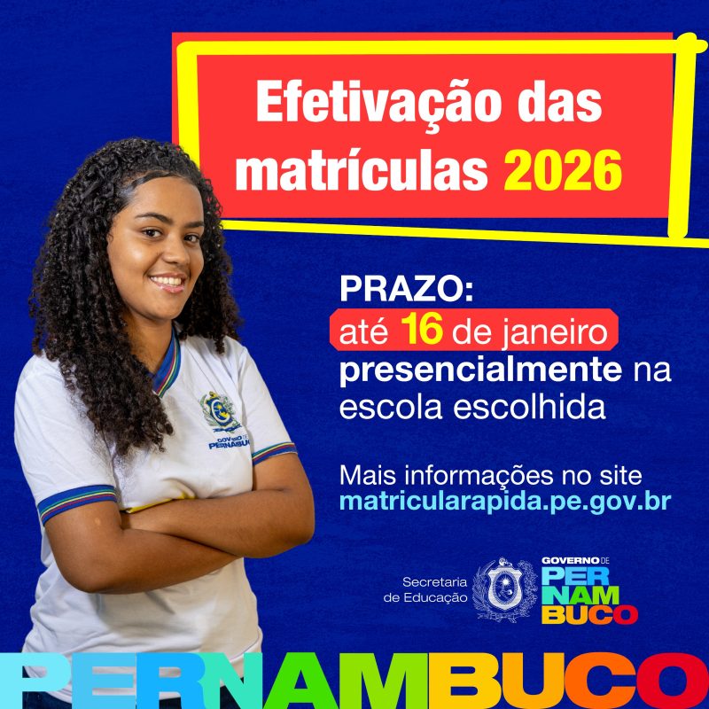 Etapa deve ser realizada presencialmente até o dia 16 Começou nesta segunda-feira (05) a etapa de efetivação das matrículas da Rede Estadual de Ensino de Pernambuco para o ano letivo de 2026. O procedimento segue até o dia 16 de janeiro e deve ser realizado presencialmente na unidade escolar escolhida no cadastro on-line.  Para confirmar…