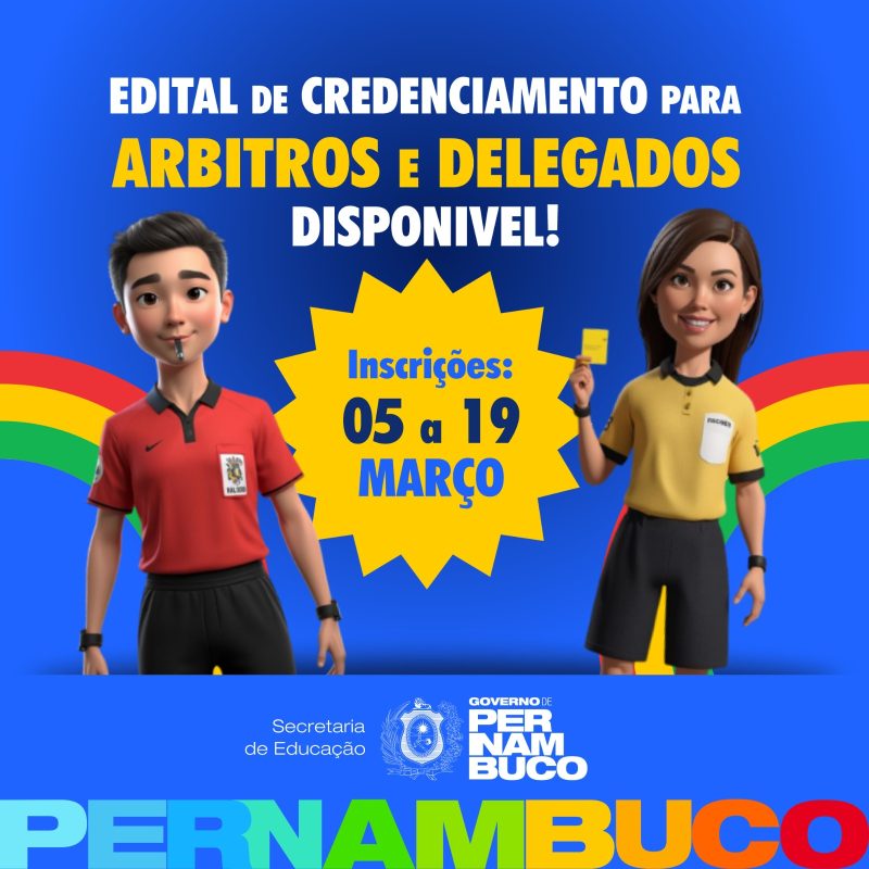 Os credenciados estarão aptos a atuar nas competições realizadas pelo órgão em todo o território pernambucano A Secretaria de Educação do Estado de Pernambuco (SEE) lançou, nesta quarta-feira (4), o edital para credenciamento de pessoas físicas para prestação dos serviços de delegado técnico e de árbitro de jogos esportivos.  Os interessados devem acessar o edital…