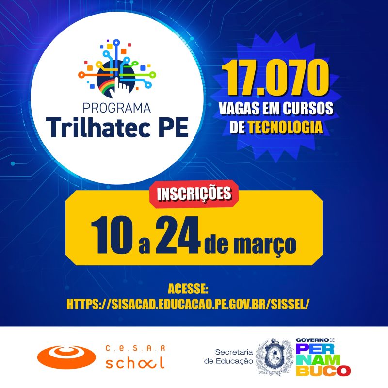 A iniciativa integra o programa Trilhatec, realizado em parceria com o Cesar School  A Secretaria Estadual de Educação (SEE) abre inscrições, nesta terça-feira (10), para cursos gratuitos de qualificação profissional em tecnologia, que integram o programa Trilhatec e serão ministrados pelo Cesar, mais completo centro de inovação e conhecimento do Brasil. Com a oferta de…