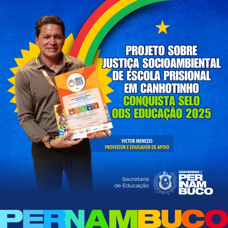 Apenas 129 instituições no Brasil receberam o selo e escola prisional é a única da rede pública estadual na lista O projeto sobre Justiça Socioambiental do professor e educador de apoio Victor Menezes, da Escola Estadual Monsenhor Adelmar da Mota Valença, unidade de ensino prisional localizada em Canhotinho, no Agreste de Pernambuco, conquistou a certificação…