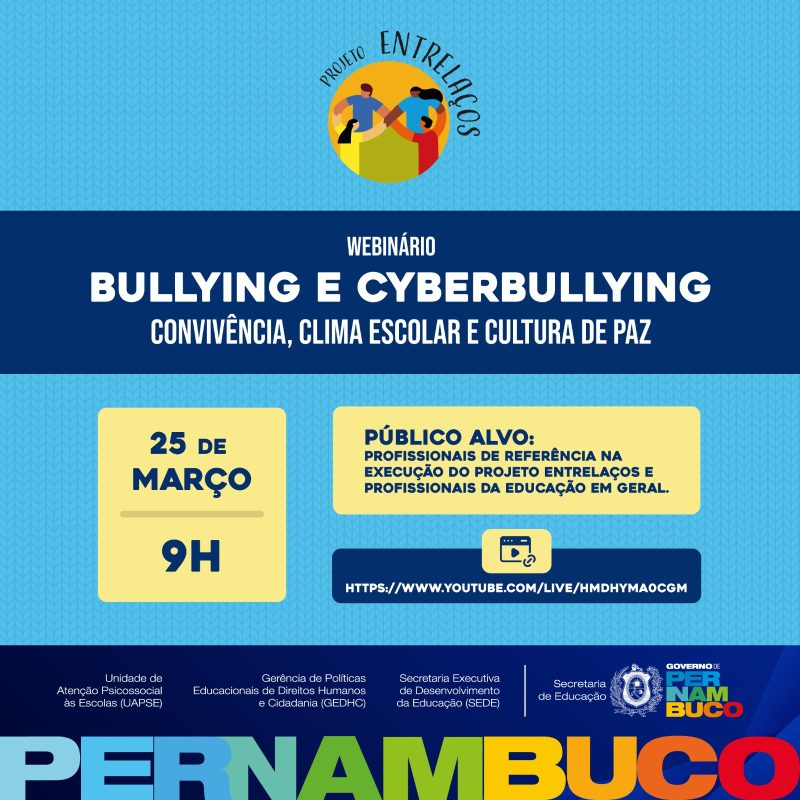 Formação aberta ao público apresenta a temática que orienta ações do projeto em abril  A Secretaria de Educação de Pernambuco (SEE) promove, na próxima quarta-feira (25), o webinário “Bullying e Cyberbullying: Convivência, Clima Escolar e Cultura de Paz”. Aberta ao público, a formação apresenta a temática de abril do EntreLaços aos profissionais que executam o…