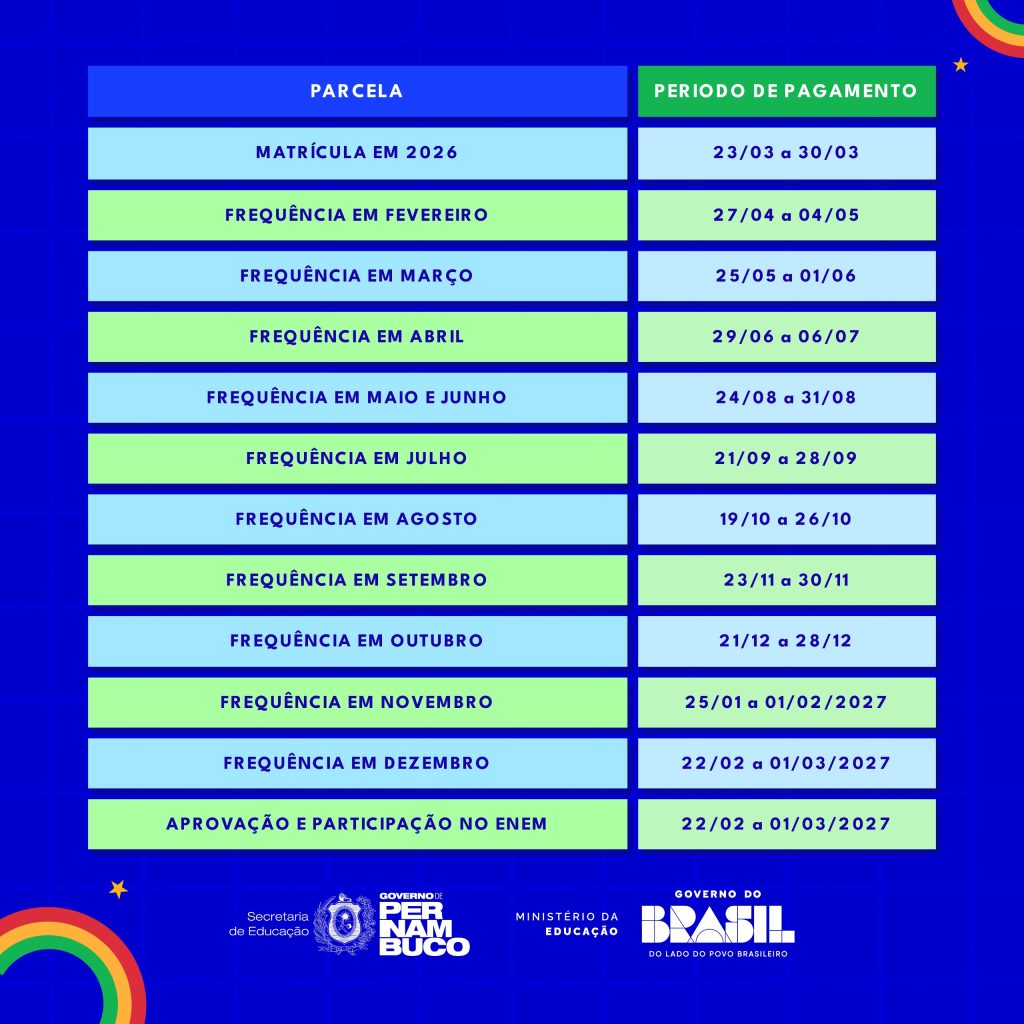 Vale acrescentar que os pagamentos finais do calendário de 2025 serão efetuados entre 26 de fevereiro e 5 de março. Estudantes aprovados no ano letivo receberão parcela de R$ 1000. Já os estudantes do último ano em 2025 que participaram dos dois dias do Exame Nacional do Ensino Médio (Enem) terão direito a uma parcela adicional de R$ 200.