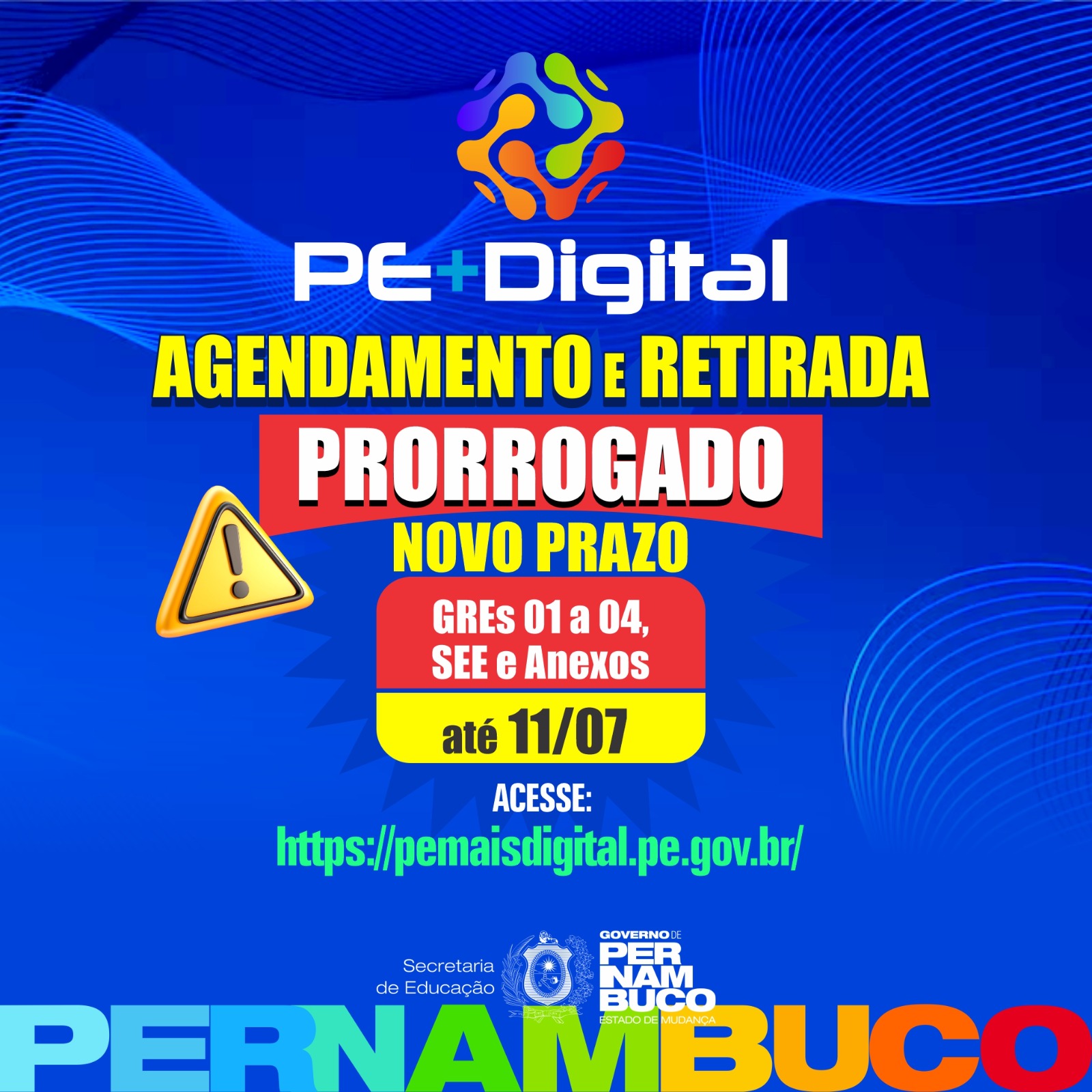 A Secretaria de Educação do Estado (SEE) de Pernambuco anunciou, nesta sexta-feira (06), a prorrogação do prazo para agendamento e retirada dos notebooks pelo programa PE + Digital. Professores, analistas e assistentes das Gerências Regionais de Educação (GREs) Recife Norte, Recife Sul, Metropolitana Norte e Metropolitana Sul, além dos servidores lotados no prédio sede da SEE e seus respectivos anexos, devem acessar o portal do programa (https://pemaisdigital.pe.gov.br/) e realizar o agendamento da retirada entre os dias 06 de junho e 11 de julho.