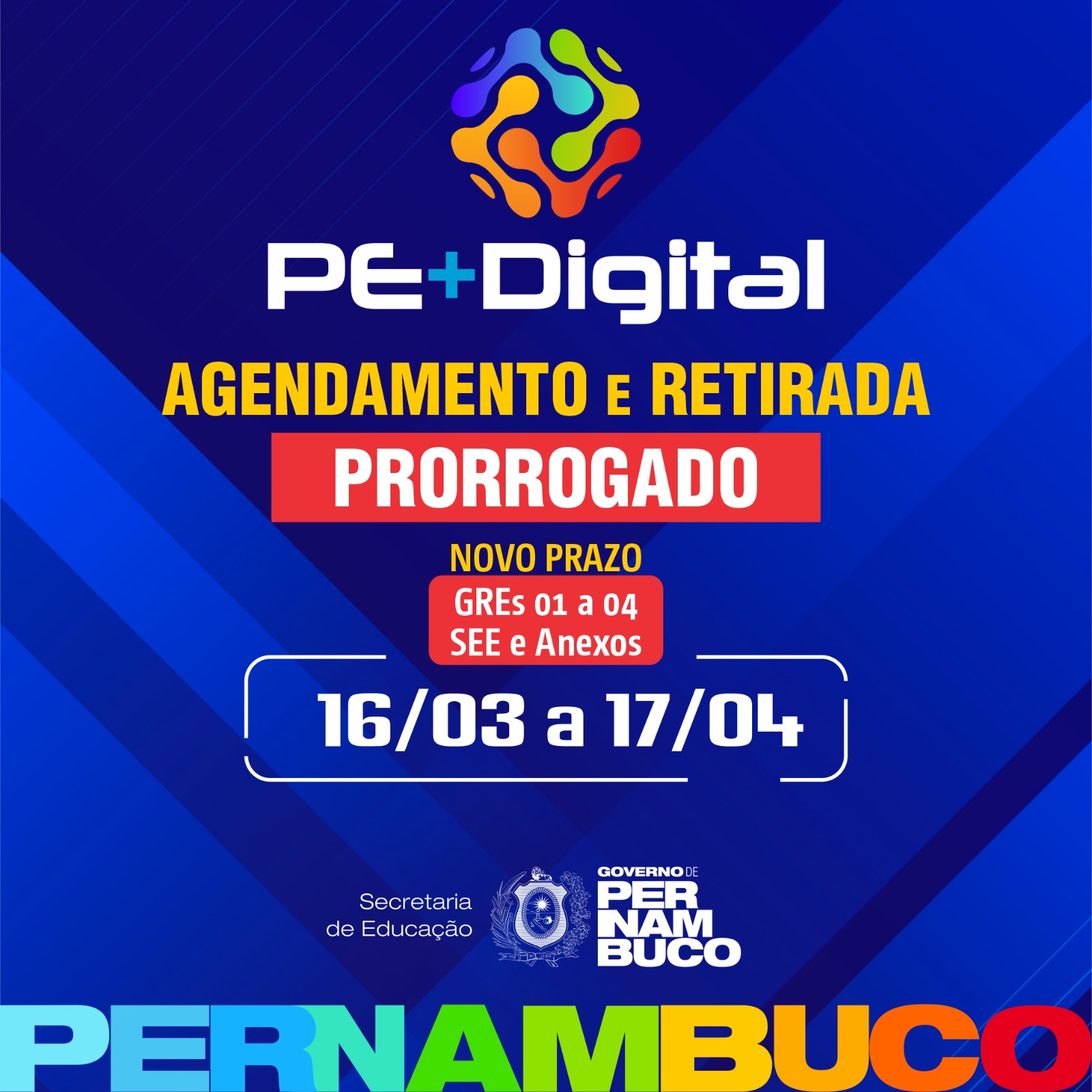 A Secretaria de Educação do Estado (SEE) de Pernambuco anunciou, nesta segunda-feira (16), a prorrogação do prazo para agendamento e retirada dos notebooks pelo programa PE + Digital. Professores, analistas e assistentes das Gerências Regionais de Educação (GREs) Recife Norte, Recife Sul, Metropolitana Norte e Metropolitana Sul, além dos servidores lotados no prédio sede da SEE e seus respectivos anexos, devem acessar o portal do programa (https://pemaisdigital.pe.gov.br/) e realizar o agendamento da retirada entre os dias 16 de março e 17 de abril.