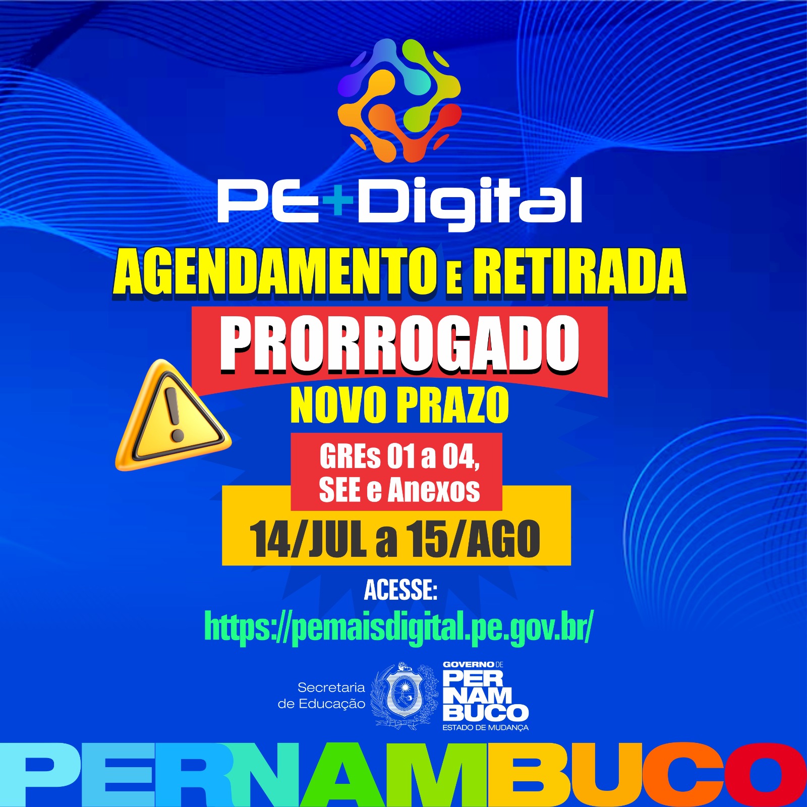 A Secretaria de Educação do Estado (SEE) de Pernambuco anunciou, nesta sexta-feira (11), a prorrogação do prazo para agendamento e retirada dos notebooks pelo programa PE + Digital. Professores, analistas e assistentes das Gerências Regionais de Educação (GREs) Recife Norte, Recife Sul, Metropolitana Norte e Metropolitana Sul, além dos servidores lotados no prédio sede da SEE e seus respectivos anexos, devem acessar o portal do programa (https://pemaisdigital.pe.gov.br/) e realizar o agendamento da retirada entre os dias 14 de julho e 15 de agosto.