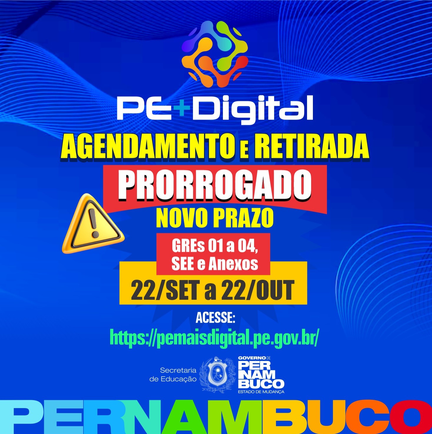 A Secretaria de Educação do Estado (SEE) de Pernambuco anunciou, nesta sexta-feira (19), a prorrogação do prazo para agendamento e retirada dos notebooks pelo programa PE + Digital. Professores, analistas e assistentes das Gerências Regionais de Educação (GREs) Recife Norte, Recife Sul, Metropolitana Norte e Metropolitana Sul, além dos servidores lotados no prédio sede da SEE e seus respectivos anexos, devem acessar o portal do programa (https://pemaisdigital.pe.gov.br/) e realizar o agendamento da retirada entre os dias 22 de setembro e 22 de outubro.