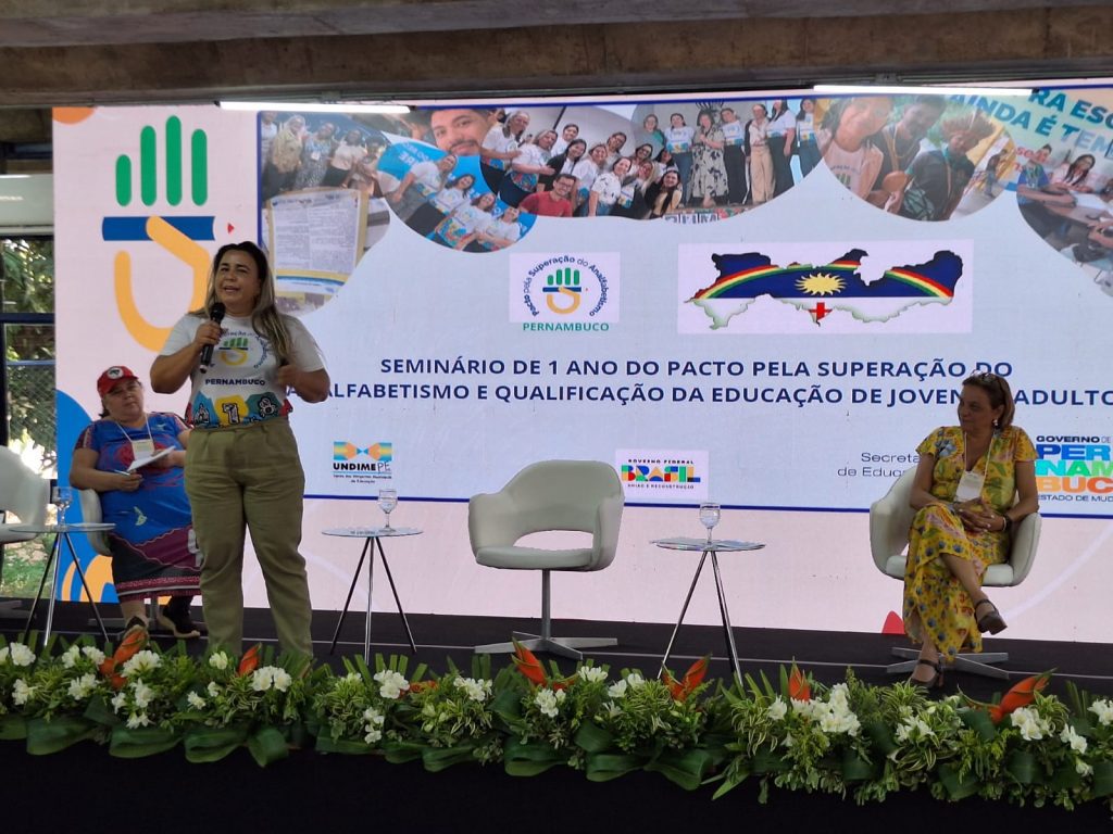 A gerente de Políticas Educacionais de Jovens, Adultos e Idosos (Gejai), Jeane Lima, e a gerente Gerência de Políticas Educacionais do Campo (Gepec), Waldenia Leão, destacaram que o estado de Pernambuco, em parceria com a UNDIME, vem acompanhando de perto as ações do Pacto no território pernambucano. Elas ressaltaram que a expectativa é de que o estado consiga superar o analfabetismo e ampliar a permanência dos estudantes da EJA.