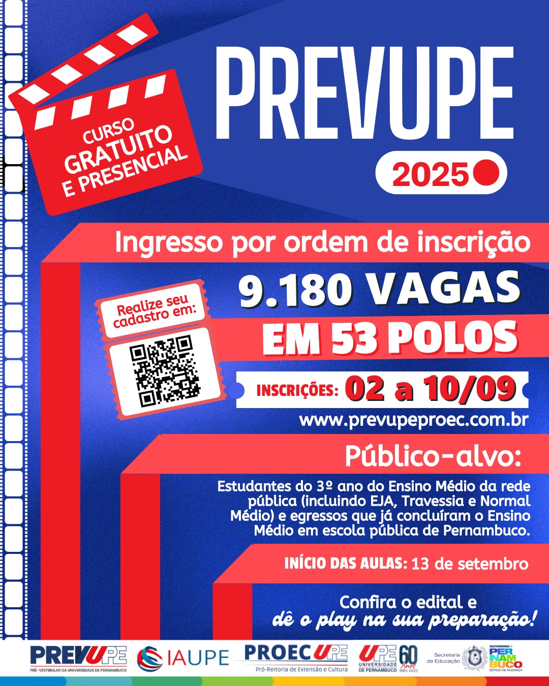A Universidade de Pernambuco (UPE), em parceria com a Secretaria de Educação, abriu, nesta terça-feira (02), as inscrições para o Programa Pré-vestibular da UPE, o Prevupe 2025. O programa, que oferece preparação gratuita para estudantes da rede pública, traz uma novidade este ano: além dos alunos do 3º ano do ensino médio, egressos da EJA Médio, EJA Campo, Travessia Médio e Normal Médio, também poderão se inscrever estudantes da Modalidade Sistema Seriado de Avaliação (SSA 1 e SSA 2). As inscrições são gratuitas e estarão abertas no período de 02 a 10 de setembro, exclusivamente pelo site www.prevupeproec.com.br.