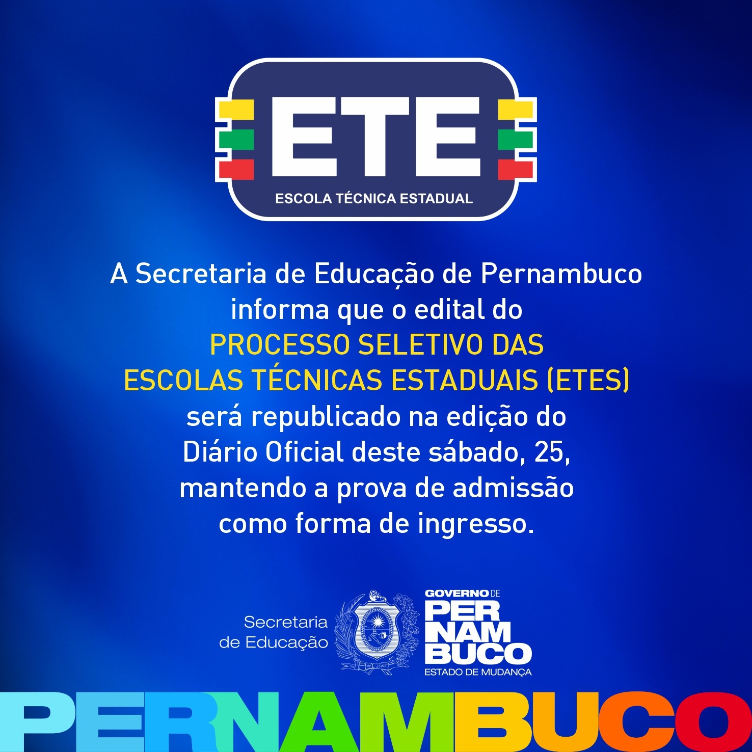 A Secretaria de Educação de Pernambuco informa que o edital do processo seletivo das Escolas Técnicas Estaduais (ETEs) será republicado na edição do Diário Oficial deste sábado, 25, mantendo a prova de admissão como forma de ingresso.