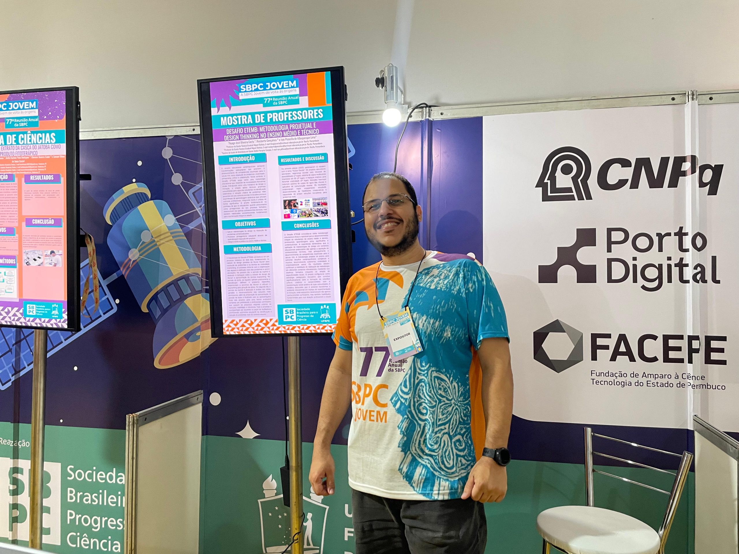 Professores da Rede Estadual de Ensino estão tendo a oportunidade de apresentar seus trabalhos durante a 77ª Reunião Anual da Sociedade Brasileira para o Progresso da Ciência (SBPC), que está acontecendo na Universidade Federal Rural de Pernambuco (UFRPE), no Recife, e segue com programação até este sábado (19). Entre eles, Thyago Costa, professor de design gráfico da Escola Técnica Estadual (ETE) Miguel Batista, no Recife, destacou um projeto que busca preparar os jovens para enfrentar os desafios contemporâneos complexos e incertos, desenvolvendo autonomia, criatividade e responsabilidade social. A metodologia utilizada pelo docente estrutura-se em um processo intensivo de dois dias, fundamentado no método de design genérico de Bruno Munari para resolução de problemas e na técnica de criatividade brainwriting.