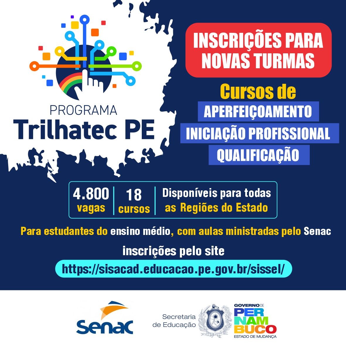 O Governo de Pernambuco, por meio da Secretaria de Educação, abriu as inscrições para as novas turmas do Programa Trilhatec. A iniciativa visa ampliar a oferta de cursos de aperfeiçoamento, iniciação profissional ou de qualificação, para estudantes do ensino médio da Rede Estadual de Pernambuco, com aulas ministradas pelo Serviço Nacional de Aprendizagem Comercial do Estado de Pernambuco (Senac). As inscrições podem ser feitas a qualquer momento pelo site https://sisacad.educacao.pe.gov.br/sissel/. Há vagas disponíveis para todas as regiões do Estado.