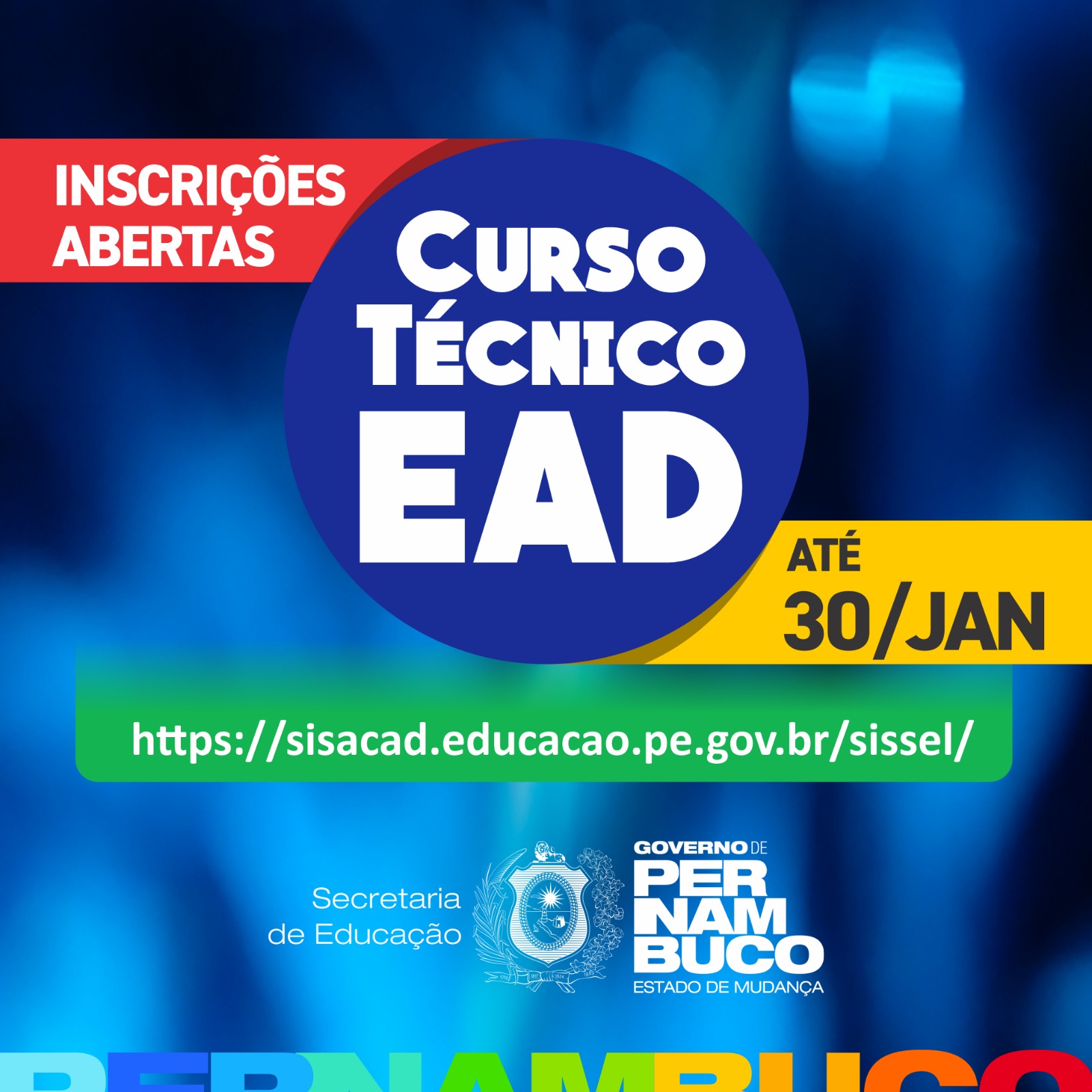 A Secretaria de Educação do Estado de Pernambuco abriu, nesta segunda-feira (20), as inscrições para os cursos técnicos de nível médio na modalidade Educação a Distância (EAD) semipresencial. São ofertadas 11.456 vagas em 11 cursos técnicos distribuídos em todas as regiões do estado. Os interessados devem se inscrever até o dia 30 de janeiro, exclusivamente pelo site https://sisacad.educacao.pe.gov.br/sissel/.