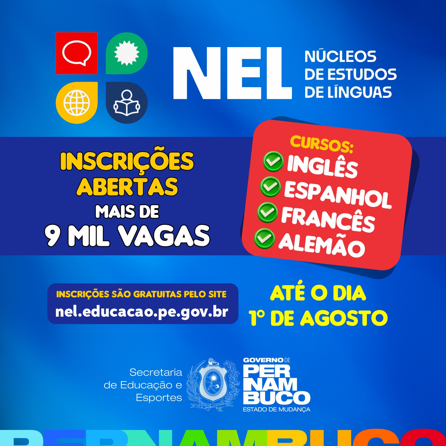 A Secretaria de Educação de Pernambuco abriu, nesta sexta-feira (04), as matrículas para os cursos gratuitos de idiomas ofertados pelos Núcleos de Estudos de Línguas (NEL) em diferentes regiões do Estado. Estão disponíveis mais de 9 mil vagas para o nível infantil, para crianças de 08 aos 12 anos, e para o nível básico iniciante, a partir dos 14 anos que possuam CPF. Serão ofertadas vagas em todo o Estado de Pernambuco, divididas entre os cursos de inglês, espanhol, francês e alemão. Os interessados devem se inscrever gratuitamente pelo site nel.educacao.pe.gov.br até o dia 1º de agosto.