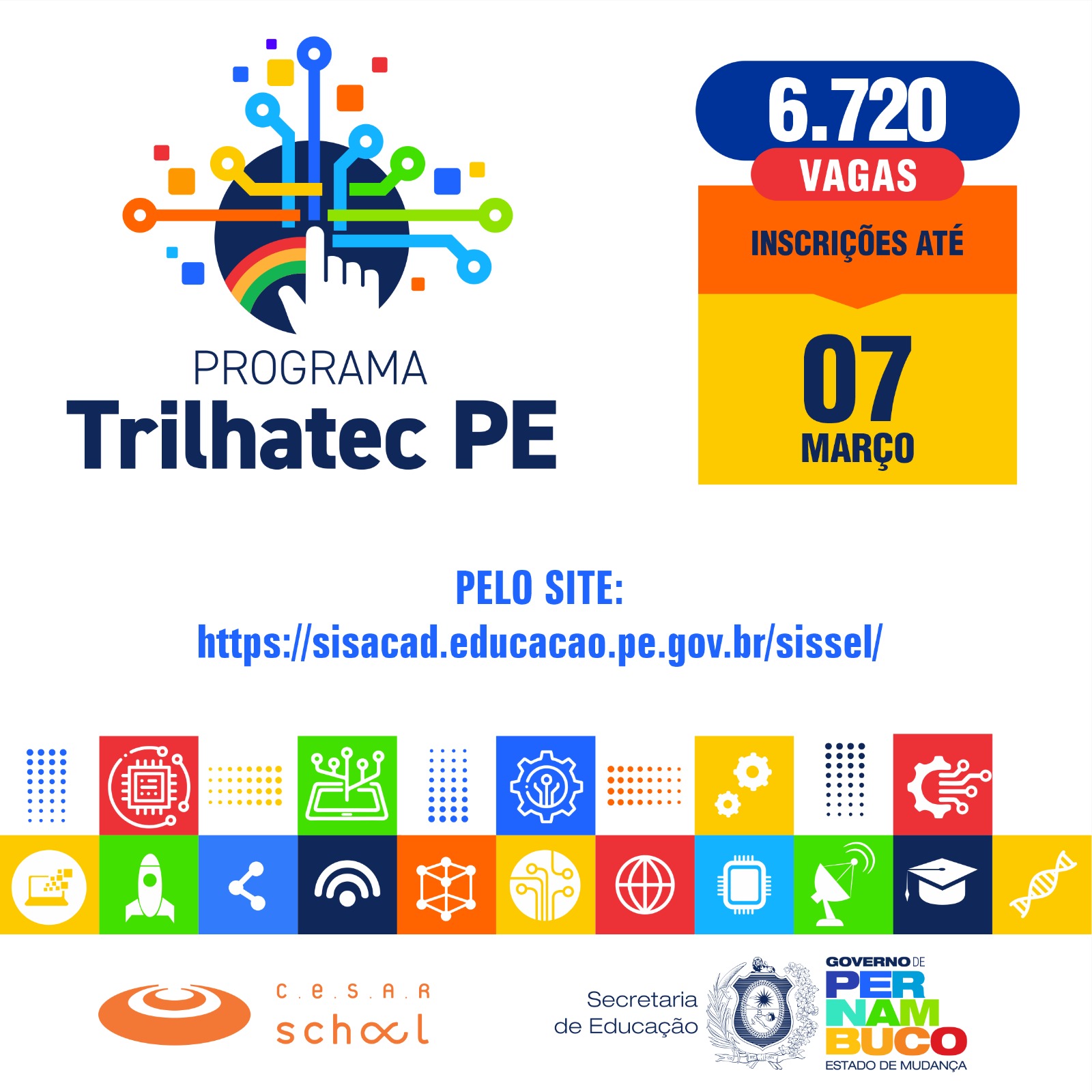Mais oportunidades de qualificação profissional para os estudantes da Rede Estadual de Ensino de Pernambuco. A Secretaria Estadual de Educação (SEE), por meio da Secretaria Executiva do Ensino Médio e Profissional (Semp), abriu, neste sábado (22), 6.720 vagas para cursos de aperfeiçoamento, iniciação profissional ou de qualificação por meio do Programa Trilhatec. As vagas são direcionadas para estudantes devidamente matriculados no ensino médio regular em todo o estado e os interessados devem se inscrever até o dia 7 de março pelo link https://sisacad.educacao.pe.gov.br/sissel/.