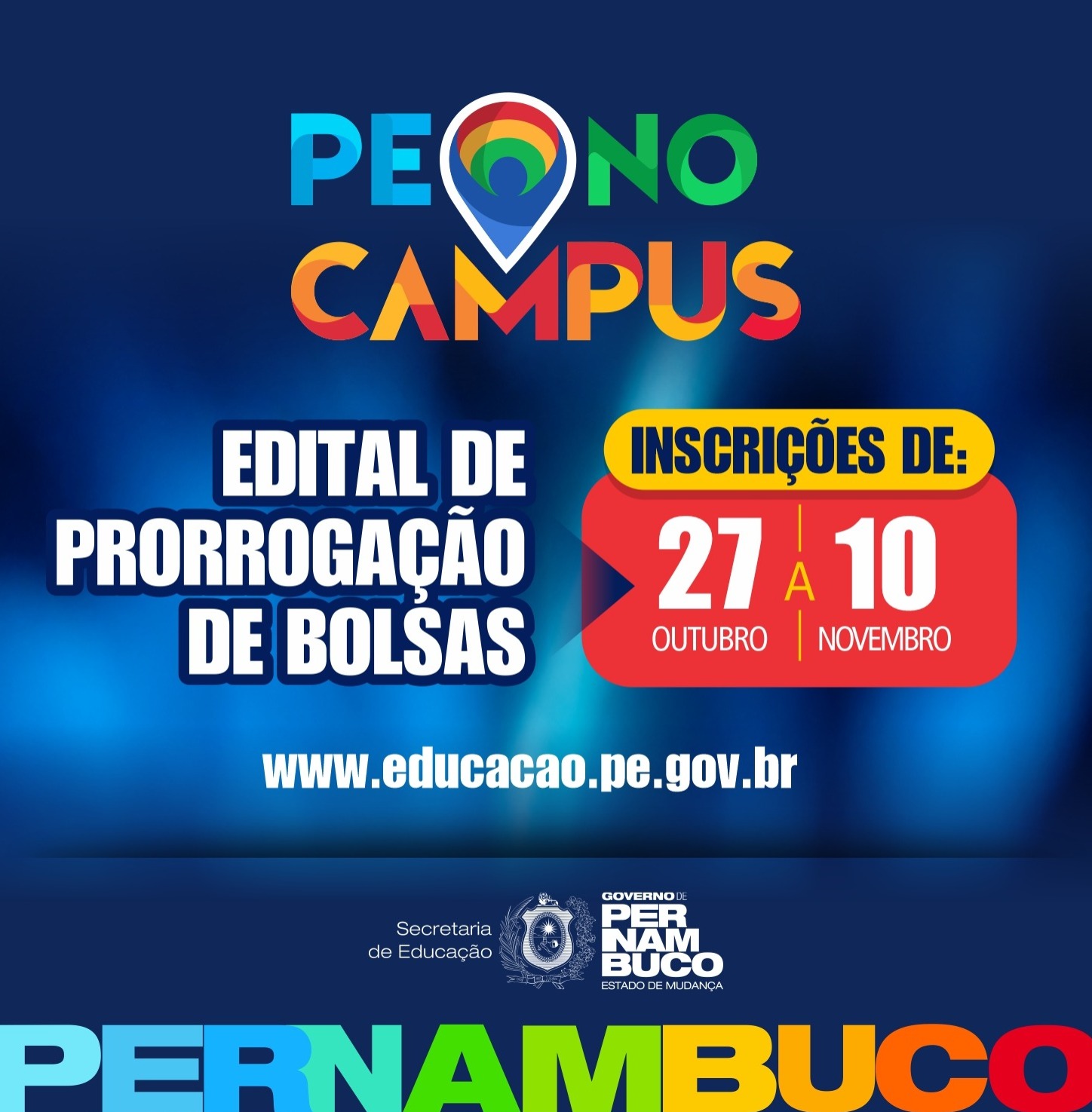 A Secretaria Estadual de Educação (SEE) divulgou, nesta segunda-feira (20), o edital de prorrogação de bolsas do programa PE no Campus. Para esta seleção, serão ofertadas 200 vagas, sendo 160 bolsas de manutenção para estudantes elegíveis que ingressaram no programa concorrendo por meio da nota obtida no Exame Nacional do Ensino Médio (Enem) e outras 40 para os que se inscreveram utilizando as notas obtidas no Sistema Seriado de Avaliação (SSA) da Universidade de Pernambuco (UPE). As inscrições deverão ser efetuadas entre os dias 27 de outubro e 10 de novembro pelo site www.educacao.pe.gov.br.