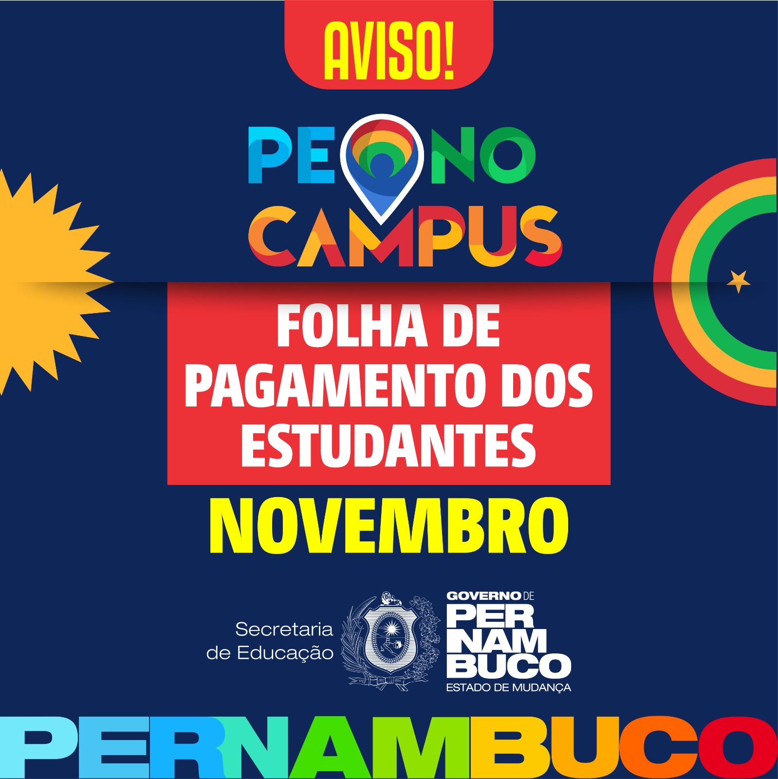 A Secretaria de Educação do Estado de Pernambuco (SEE) divulgou a lista de pagamento do mês de novembro do programa PE no Campus. O pagamento está em processamento e todos os beneficiados irão receber a partir desta sexta-feira (28). A folha de pagamento pode ser acessada aqui.