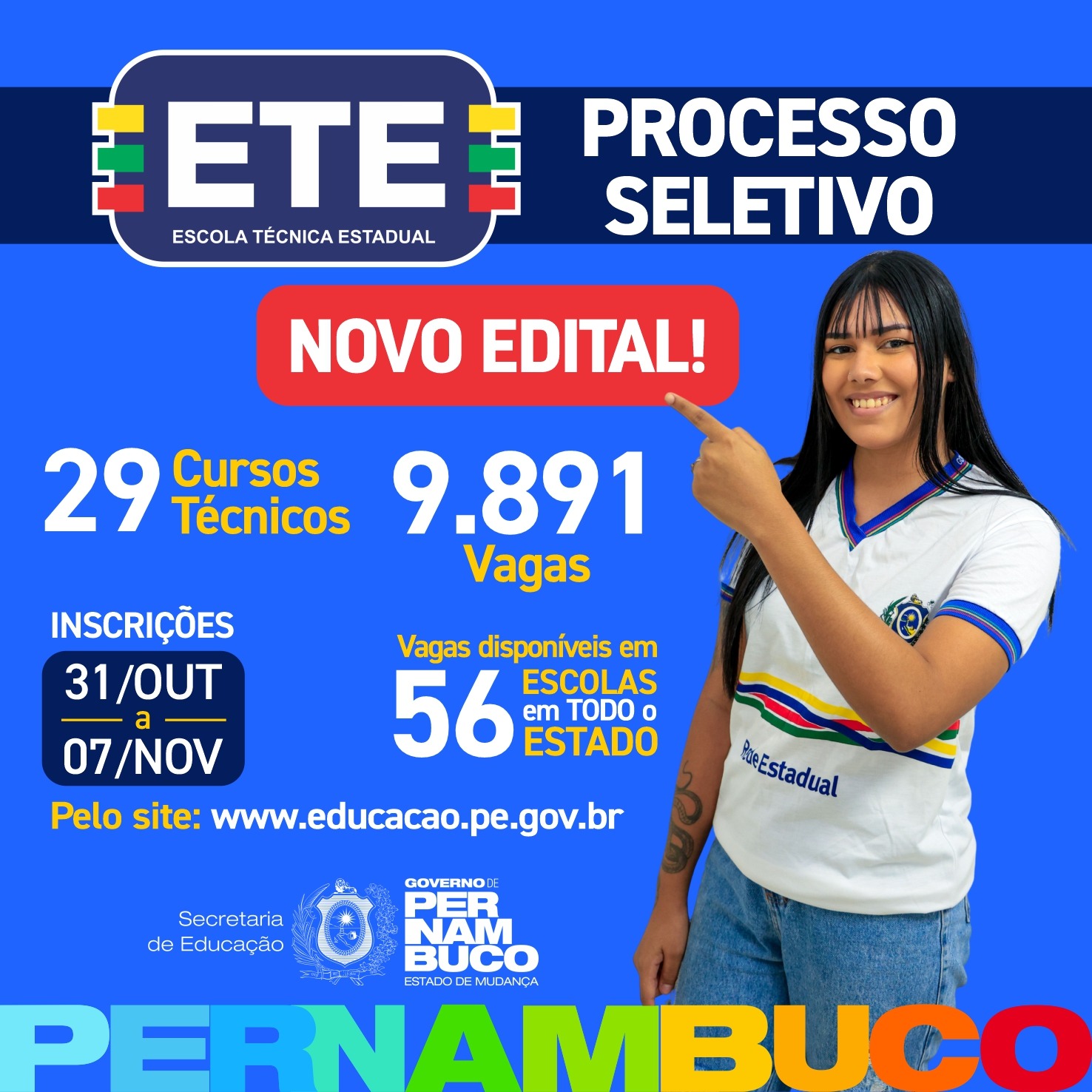 A Secretaria de Educação de Pernambuco (SEE) relançou o edital para o processo seletivo das Escolas Técnicas Estaduais (ETEs) no Diário Oficial deste sábado (25), mantendo a prova de admissão como forma de ingresso, como já vinha acontecendo nas edições anteriores do certame. Para o ano letivo de 2026, serão ofertadas 9.891 vagas em 29 cursos técnicos na forma de Ensino Médio Integrado à Educação Profissional, em jornada integral. Os interessados devem se inscrever de 31 de outubro a 7 de novembro pelo site www.educacao.pe.gov.br.