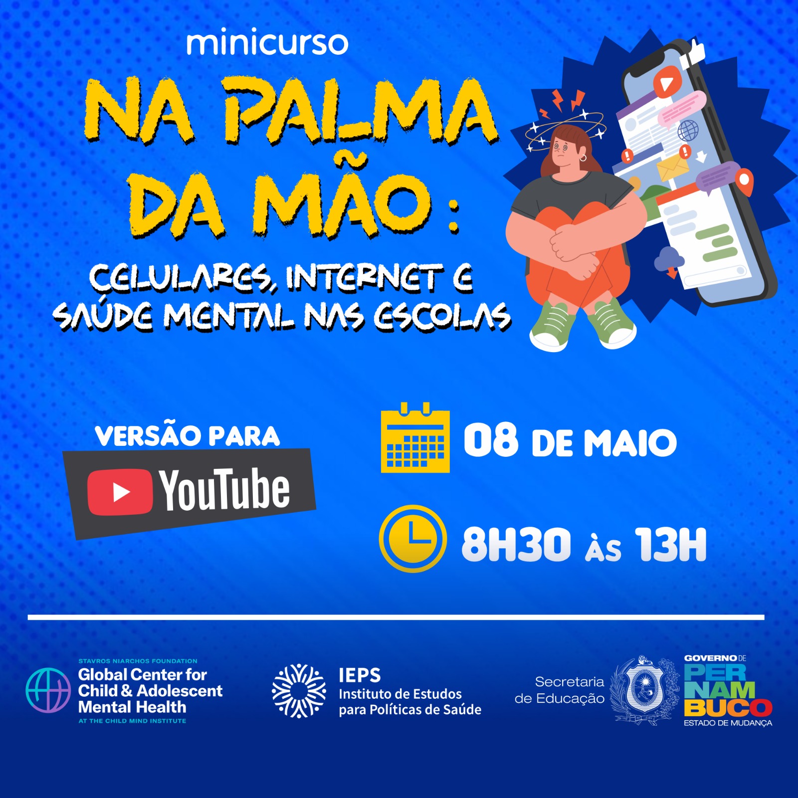 A Secretaria de Educação do Estado de Pernambuco (SEE) realizou, nesta quinta-feira (08), o minicurso online “Na Palma da Mão: Celulares, Internet e Saúde Mental nas Escolas”. A iniciativa foi desenvolvida por meio da Unidade de Atenção Psicossocial à Escola (UAPSE) e a Gerência de Políticas Educacionais de Direitos Humanos e Cidadania (GEDHC) em parceria com o Instituto de Estudos para Políticas de Saúde (IEPS). Participaram do encontro, transmitido pelo Youtube, cerca de 450 profissionais entre gestores escolares e Técnicos dos Núcleos de Atenção Psicossocial à Escola (NAPSEs) das 16 Gerências Regionais de Educação do estado de Pernambuco.