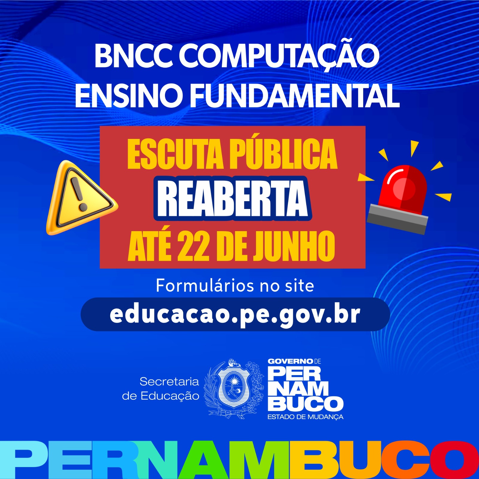 Está reaberta a escuta pública que vai embasar a implementação do componente Computação na Base Nacional Comum Curricular (BNCC), contextualizada ao Currículo de Pernambuco. Para participar, professores da Rede Estadual, das redes municipais e da rede privada devem acessar os formulários específicos para cada série do ensino fundamental (1º ao 9º ano)  ou para as etapas dos anos iniciais e anos finais. Os formulários podem ser acessados AQUI e ficarão disponíveis até o dia 22 de junho.